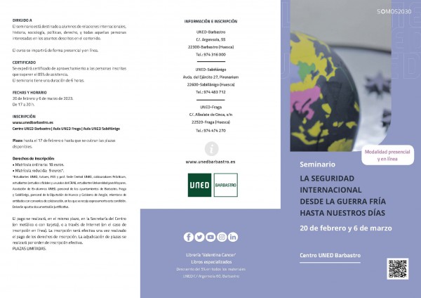 El seminario está encaminado al estudio de la parte de las relaciones internacionales que afecta a la seguridad internacional desde el final de la II Guerra Mundial hasta el momento actual. La seguridad no es un concepto relacionado exclusivamente con lo militar o policial. La seguridad que trataremos en este curso es un concepto amplio que abarca desde lo militar a lo político y lo económico. Se dedicará especial atención al concepto de seguridad humana, que es aquella que se centra en las personas, en su dignidad, su libertad y su bienestar.