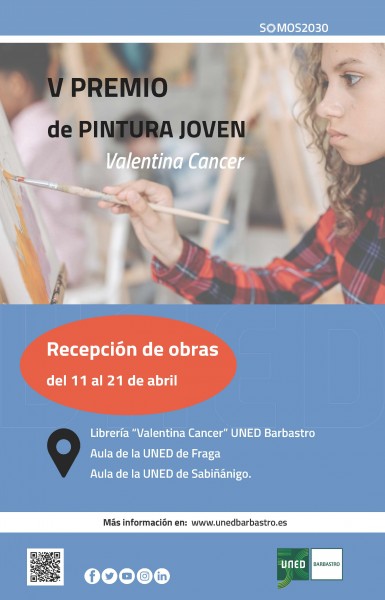 Con la finalidad de apoyar a los artistas jóvenes, dando un reconocimiento a su creatividad, la librería ‘Valentina Cancer’ del Centro de la UNED de Barbastro convoca el V Premio de Pintura Joven.