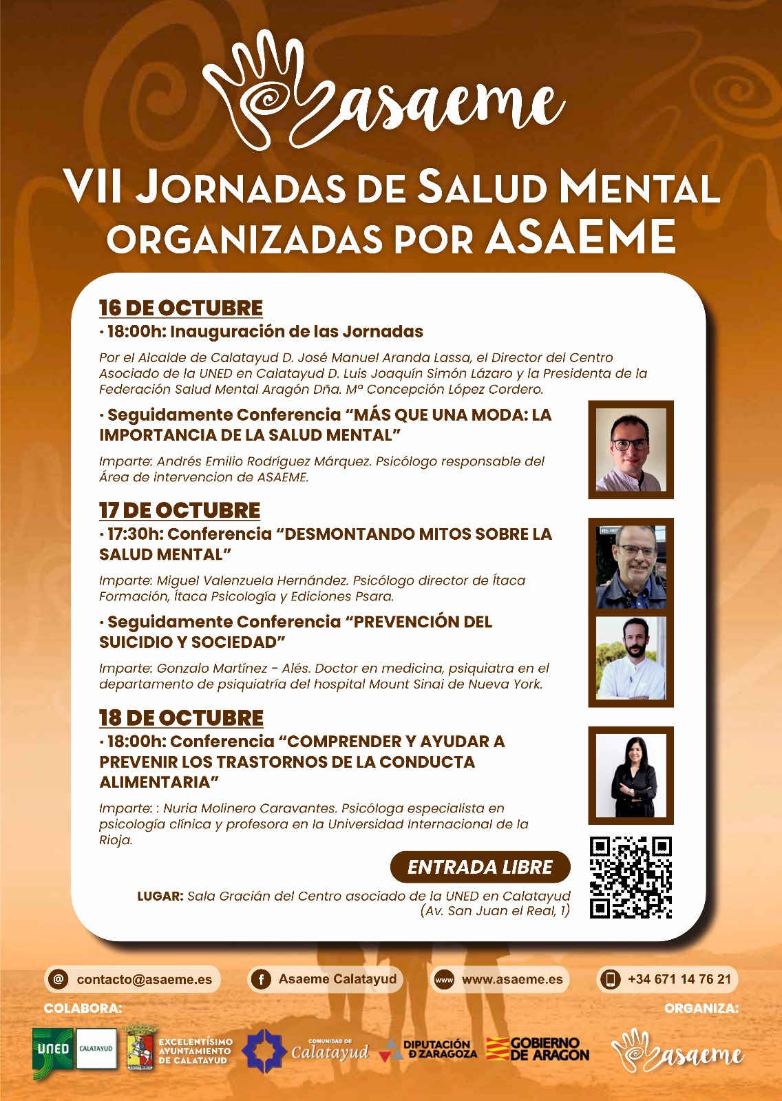 La Asociación Augusta de Enfermos Mentales de Calatayud (ASAEME) os presenta las VI Jornadas de Salud Mental, en conmemoración del Día Mundial de la Salud Mental. Estas jornadas se llevarán a cabo del 16 al 18 de octubre en UNED Calatayud.