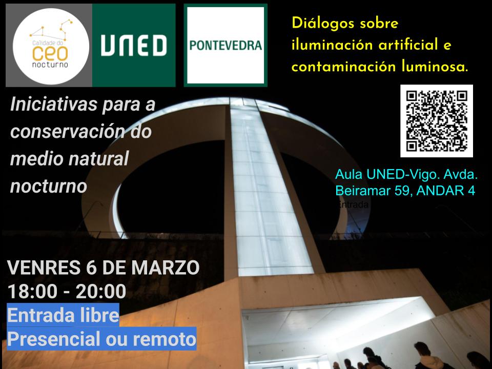 La contaminación lumínica es un problema ambiental, económico y de salud conocido desde hace mucho tiempo, pero que aún se encuentra en proceso de afianzarse en el debate público. Sus consecuencias son muy diversas, desde el derroche energético y la contaminación atmosférica hasta el desplazamiento y la extinción de poblaciones animales, los problemas de salud en las personas, así como cuestiones de seguridad y el desarrollo de un turismo responsable. La contaminación lumínica es un tema de actualidad que necesita espacios no solo para ser presentado y divulgado, sino también espacios de discusión y contacto abiertos a todo el mundo: expertos, escépticos, personas curiosas, aprendices, personas con dudas… Por ello, el colectivo Calidade do Ceo Nocturno, junto con el Centro Asociado de Pontevedra de la UNED, propone una vez al mes un tema relacionado con la iluminación nocturna y la contaminación lumínica para hablar abiertamente sobre él.