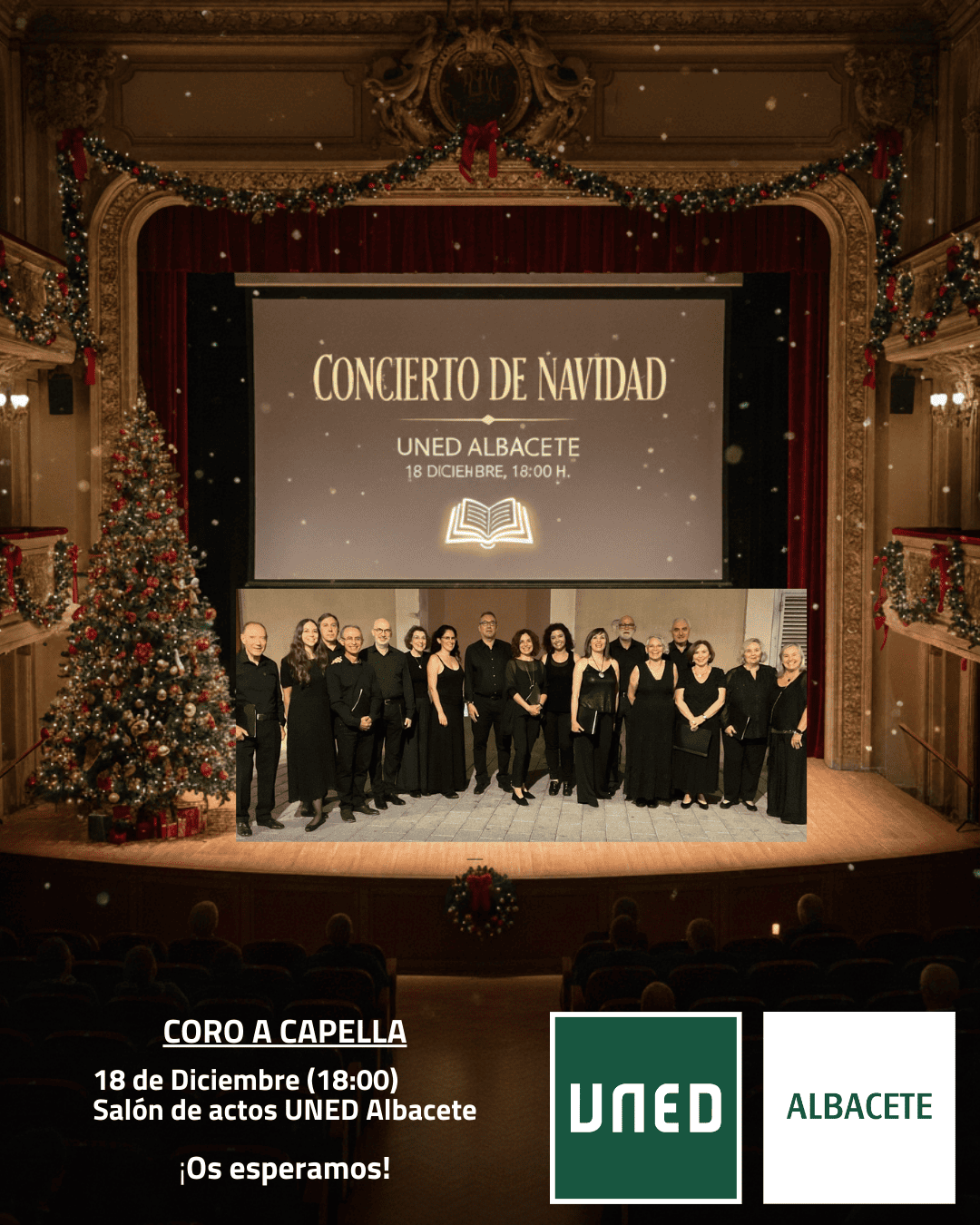 El Centro Asociado de la UNED en Albacete se complace en invitarles a disfrutar de un emotivo Concierto de Navidad a cargo del Coro A Capella. En esta ocasión tan especial, el coro nos ofrecerá un recorrido musical lleno de armonía y tradición, creado para celebrar estas fechas con alegría, calidez y espíritu navideño. Será un encuentro cultural abierto a toda la comunidad, pensado para compartir la magia de la música y dar la bienvenida a la Navidad en un ambiente cercano y festivo.