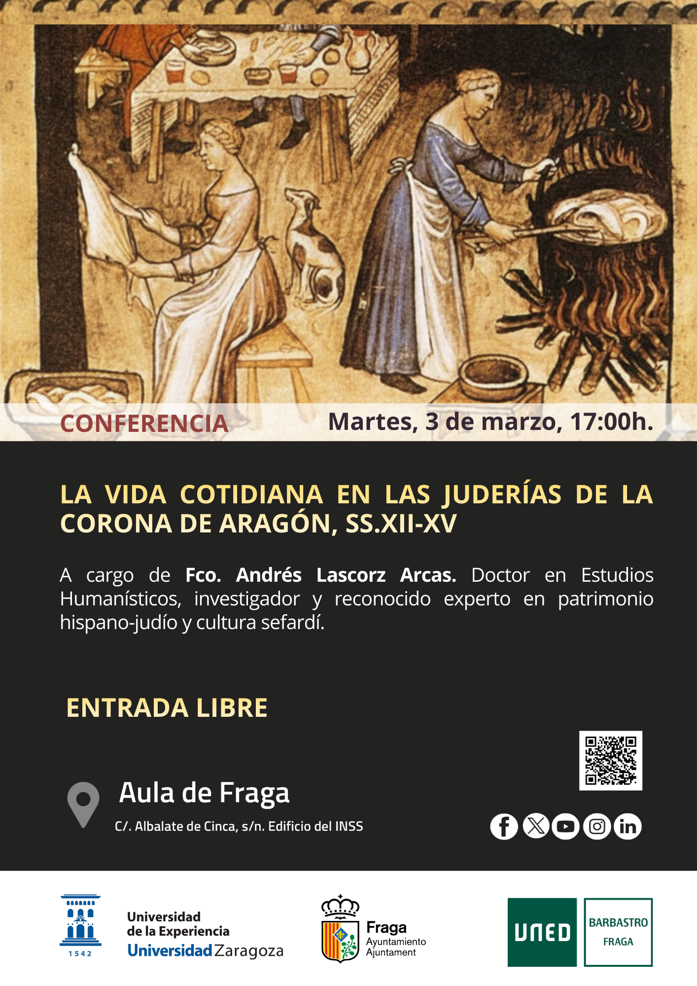 La charla aborda el estudio de las comunidades judías en los reinos medievales de la península ibérica como vía fundamental para comprender la vida social, política y religiosa de la época. Desde un enfoque sociohistórico, se analiza su presencia en la Corona de Aragón durante la Baja Edad Media, integrando distintas perspectivas para ofrecer una visión compleja y rigurosa de esta minoría.