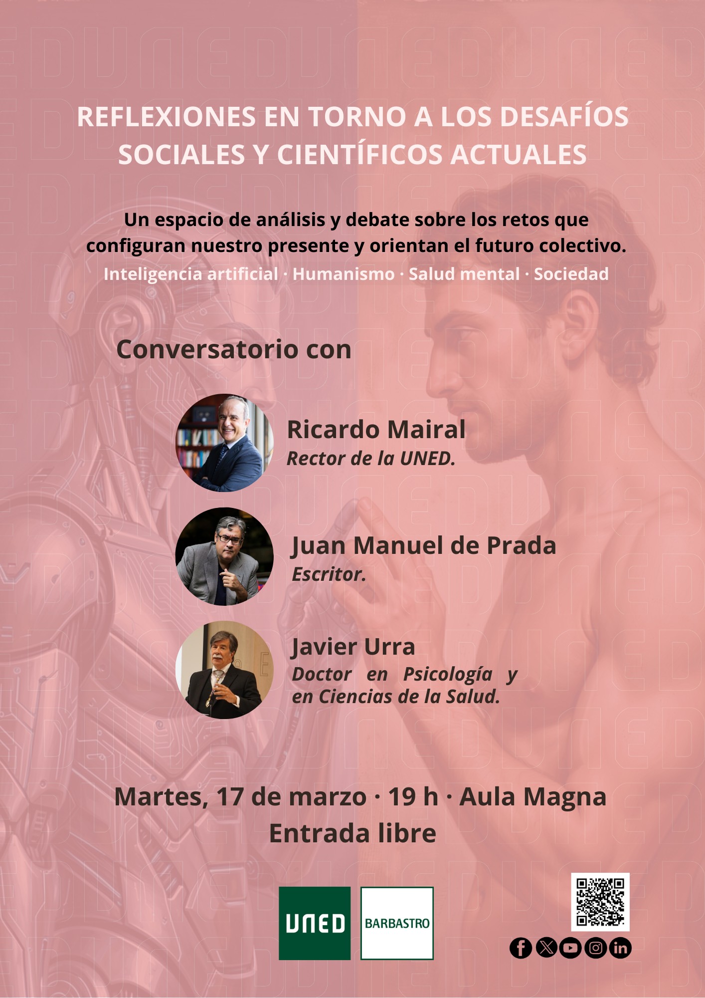 Este conversatorio propone una reflexión general sobre los principales desafíos sociales y científicos del mundo contemporáneo, destacando su carácter interconectado. En este marco se plantearán cuestiones como el impacto de la inteligencia artificial, la vigencia del humanismo y la creciente relevancia de la salud mental en las sociedades actuales. El objetivo es que sea un espacio de análisis y debate sobre cómo estos retos influyen en el presente y orientan el futuro colectivo.