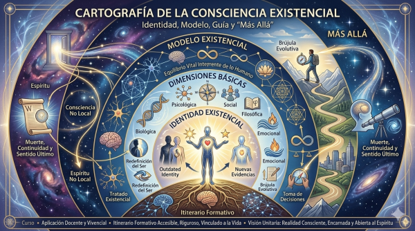 Este curso es una aplicación docente y vivencial del tratado existencial sobre nuestra especie, del que el profesor responsable ha publicado hasta ahora cuatro volúmenes y prepara ya el quinto. A lo largo de esa obra se ha ido articulando una visión unitaria del ser humano como realidad consciente, encarnada y, al mismo tiempo, abierta a una dimensión espiritual que desborda la mera supervivencia biológica. “Consciencia existencial: identidad, modelo, guía y ‘más allá’” propone traducir ese trabajo teórico de largo recorrido en un itinerario formativo accesible, riguroso y directamente vinculado a la propia vida de los participantes. El curso se organiza en cinco grandes bloques. En Identidad existencial se aborda la redefinición como seres y miembros de nuestra especie, ya que la definición habitual está anticuada y existen nuevas evidencias que deben ser integradas en nuestra propia concepción e identidad existenciales. En cuanto al módulo de las Dimensiones básicas, supone un resumen ecléctico y práctico de nuestros ámbitos existenciales para poder conformarse una idea práctica o resolutiva de cara a abordar mejor nuestra vida. En Modelo existencial se presenta el marco básico del equilibrio vital integrador de nuestra especie como sistema consciente complejo, poniendo en relación aportaciones científicas, filosóficas y espirituales para ofrecer una cartografía coherente de lo humano. El módulo Guía existencial se centra en nuestra evolución como especie como brújula para tomar decisiones, atravesar crisis, orientar y alinear vida interior y acción en el mundo. Finalmente, el bloque “Más allá” abrirá el horizonte hacia la cuestión del espíritu y de una posible consciencia no local: exploraremos las preguntas límite sobre muerte, continuidad de la consciencia y sentido último, dialogando entre tradición espiritual e investigaciones contemporáneas.