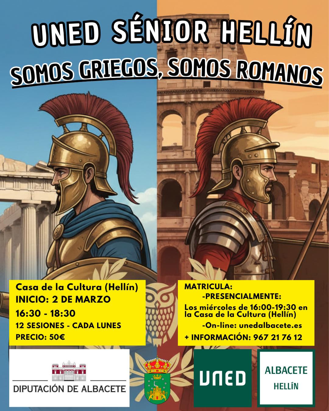 El curso “Somos griegos, somos romanos”, organizado por la UNED y dirigido a personas mayores de 55 años de la población de Hellín, propone un recorrido ameno por las raíces de la civilización occidental. A través del legado cultural, histórico y artístico de Grecia y Roma, el alumnado descubrirá cómo muchas de nuestras ideas, costumbres y formas de vida actuales tienen su origen en el mundo clásico. El curso invita a aprender, reflexionar y disfrutar del conocimiento en un entorno cercano, fomentando la curiosidad intelectual y el envejecimiento activo.